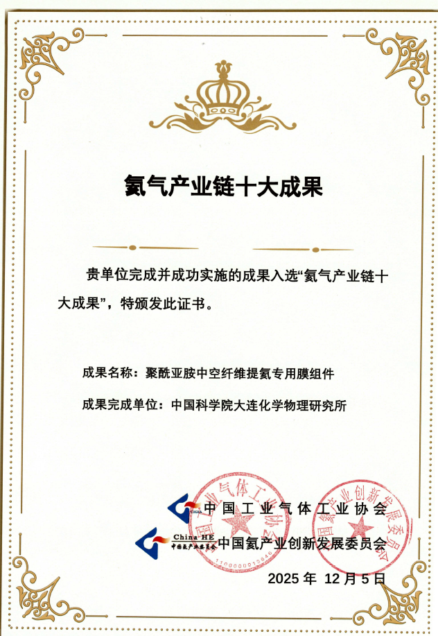 图2 聚酰亚胺中空纤维提氦专用膜组件获奖证书